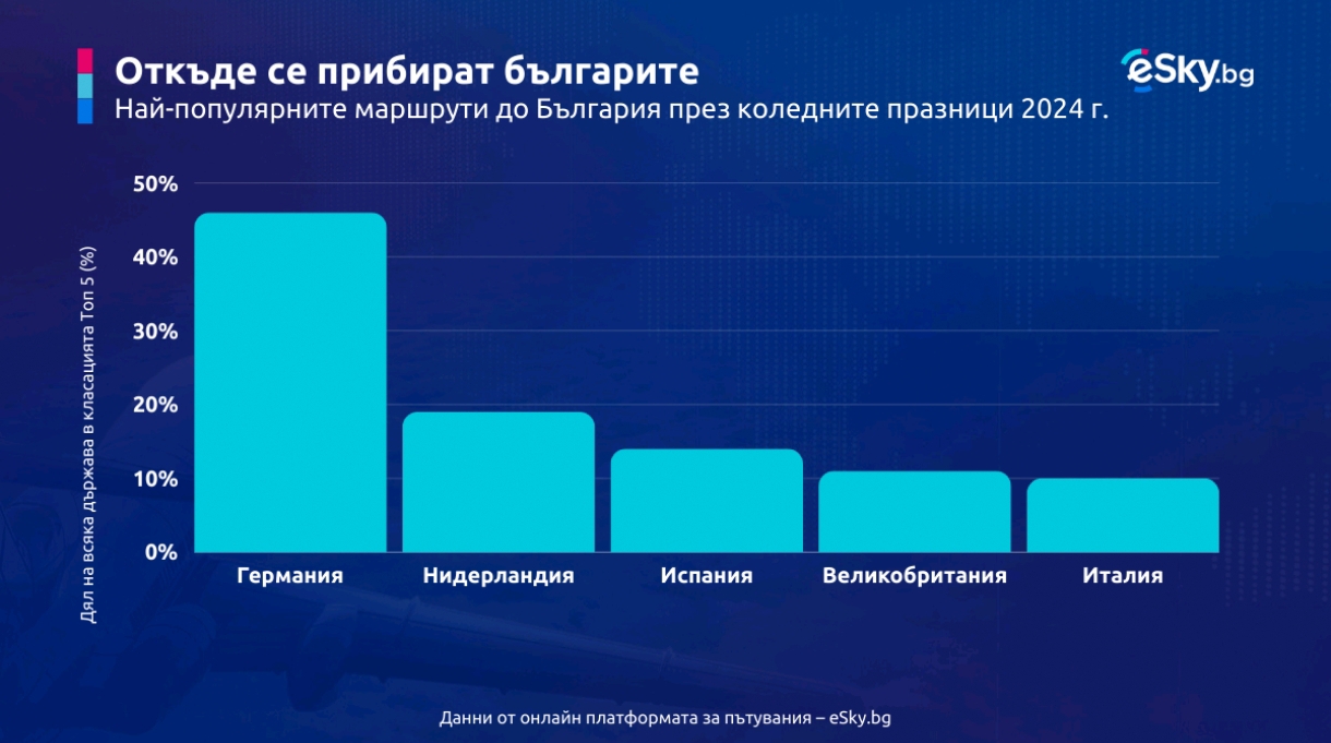 Германия, Нидерландия и Италия: това са страните, от които се завръщат българите за Коледа, резервирали полети до България с онлайн туристическа агенция eSky.bg. Българските общности в Обединеното кралство и Испания също планират посещения на семействата си. Те обикновено прекарват между 7 и 9 нощувки в България, като българите, живеещи в Италия, резервират най-изгодните полети. От друга страна, тези, които летят от Нидерландия, плащат най-много.