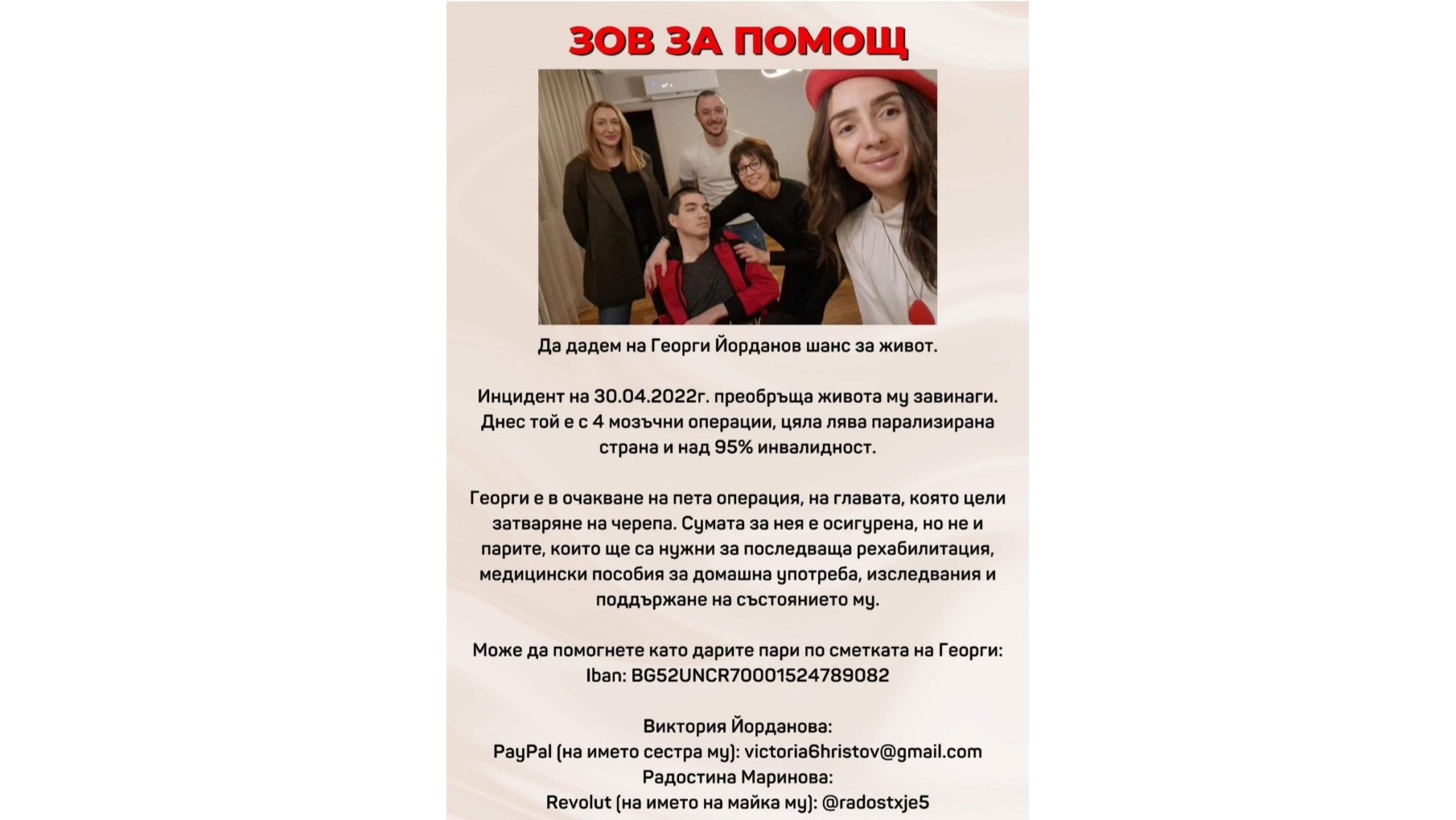 На 30.04.2022г., нашият приятел, Георги Миленов Йорданов претърпя инцидент. В продължение на вече повече от година, семейството му се бори да си го върне. Поне малко, какъвто беше и какъвто го познаваме.