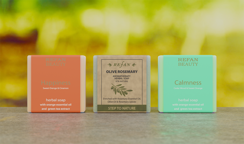 Колекцията STEP TO NATURE на REFAN включва серия от сапуни с 97% натурални съставки, обогатени с чисти етерични масла и билки с дълготраен аромат – на роза, лавандула, мента, лимон и вербена, розмарин и маслина, на свежи листа от зелен чай.