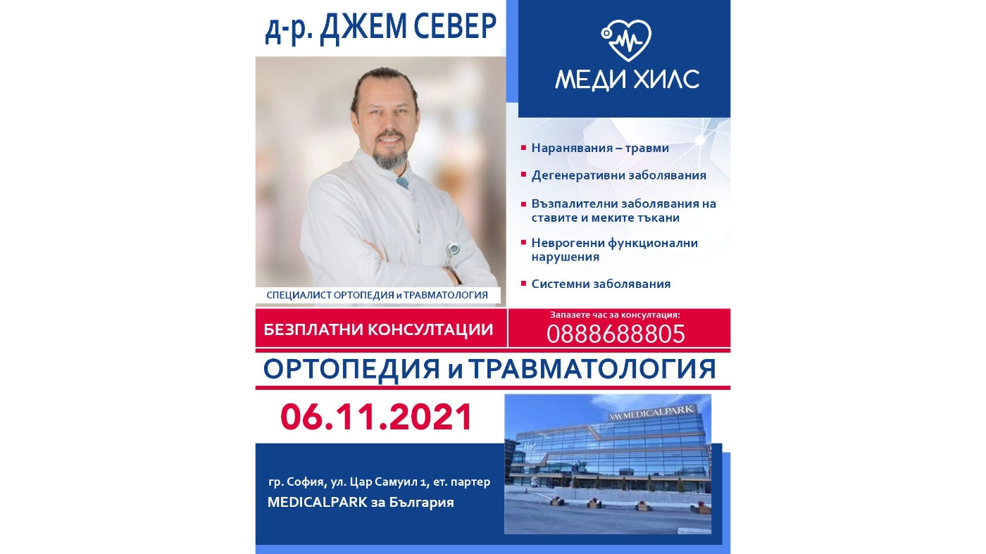 НА 06.11.2021 ,В СОФИЯ, В ПРЕДСТАВИТЕЛНИЯ ОФИС НА БОЛНИЦИ MEDICALPARK ЗА БЪЛГАРИЯ (ЗДРАВНО ИНФОРМАЦИОНЕН ЦЕНТЪР МЕДИ ХИЛС) ЩЕ ГОСТУВА ЕДНО ОТ НАЙ ГОЛЕМИТЕ ИМЕНА НА ТУРЦИЯ В ОБЛАСТТА НА ОРТОПЕДИЯ И ТРАВМАТОЛОГИЯ, Д-Р ДЖЕМ СЕВЕР. БЕЗПЛАТНИТЕ КОНСУЛТАЦИИ СА С ПРЕДВАРИТЕЛНО ЗАПИСВАНЕ НА ТЕЛ:0888688805, адрес София,ул. Цар Самуил 1 (пряка на бул.Патриарх Ефтимий) ет. партер.