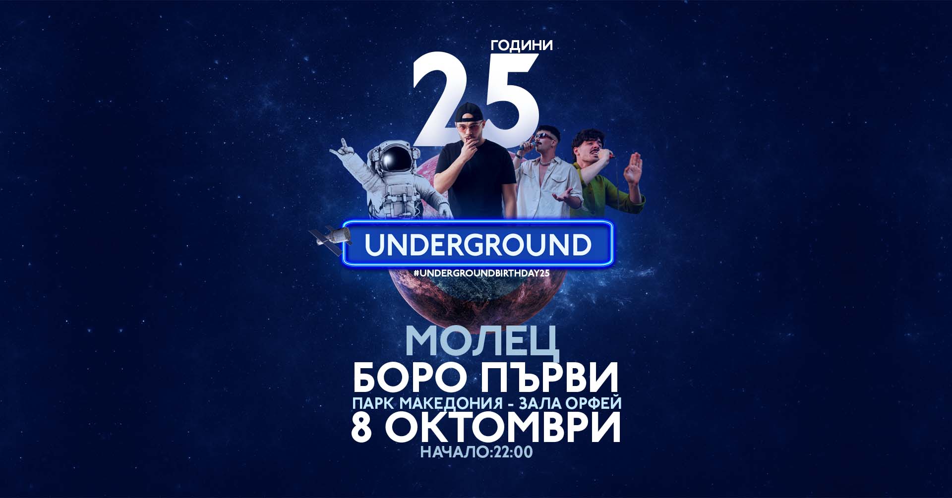 Четвърт век с незабравими партита, четвърт век с хора, които знаят как да се забавляват и място на което всичко е възможно.. Е, сега Underground излиза от клуба и се пренася на голямата сцена, на която всички ще могат да се насладят на обичаният рапър на новото време Боро Първи и група МОЛЕЦ, които спечелиха сърцата на хората с красивите си текстове и различно звучене. Дали това пък не е началото на нов стил парти в Благоевград? Предстои да разберем.