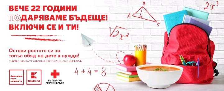 Традиционната съвместна инициатива с БЧК в полза на Програма „Топъл обяд“ всяка година стартира в Kaufland в навечерието на предстоящата учебна година. Със събраните средства хуманитарната организация дарява безплатна топла храна в училище за деца в неравностойно положение – сираци, полусираци, от многодетни семейства или с трайно безработни родители. Според данни на БЧК, осигурената подкрепа за децата от уязвимите групи е ключова мярка срещу отпадането им от училище.