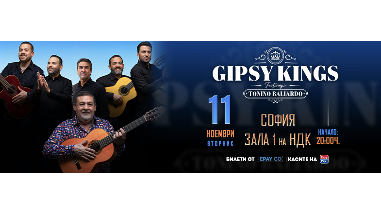 Световноизвестната група Gipsy Kings, водена от легендарния китарист и основател Тонино Балиардо (Tonino Baliardo), отново ще зарадва българската публика с два незабравими концерта. Първият спектакъл ще се състои на 11 ноември в Зала 1 на НДК, София, с начален час 20:00 ч., а само ден по-късно, на 12 ноември, групата ще свири в зала „Колодрум“, Пловдив.