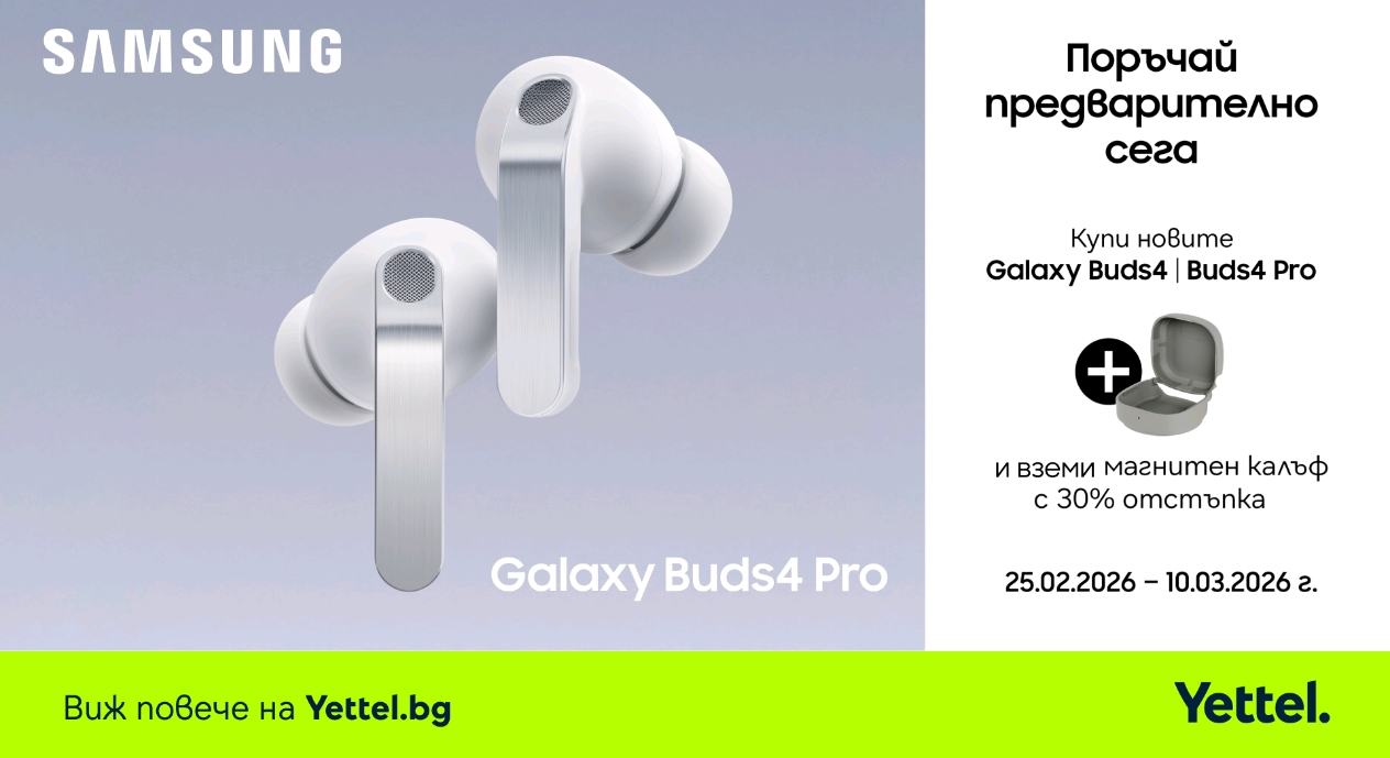 Паралелно с официалното представяне на новото поколение флагмани от серията S26, Samsung разширява и аудио портфолиото си с моделите Samsung Galaxy Buds4 и Buds4 Pro. Новите слушалки вече могат да бъдат предварително заявени от Yettel до 23:59 ч. на 10 март 2026 г., като при покупка на някой от двата модела, клиентът има възможност да закупи и сив калъф Magnet Stand с 30% намаление от редовната цена.