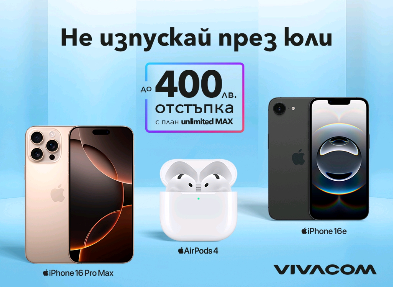 Юли идва с горещи оферти за феновете на Apple – само този месец Vivacom предлага до 400 лв. отстъпка на едни от най-търсените модели на марката. Лятната промоция е валидна в магазините и онлайн на сайта на Vivacom в комбинация с план Unlimited MAX за максимална свобода на общуването в 5G мрежата с най-голямо покритие в България[1].