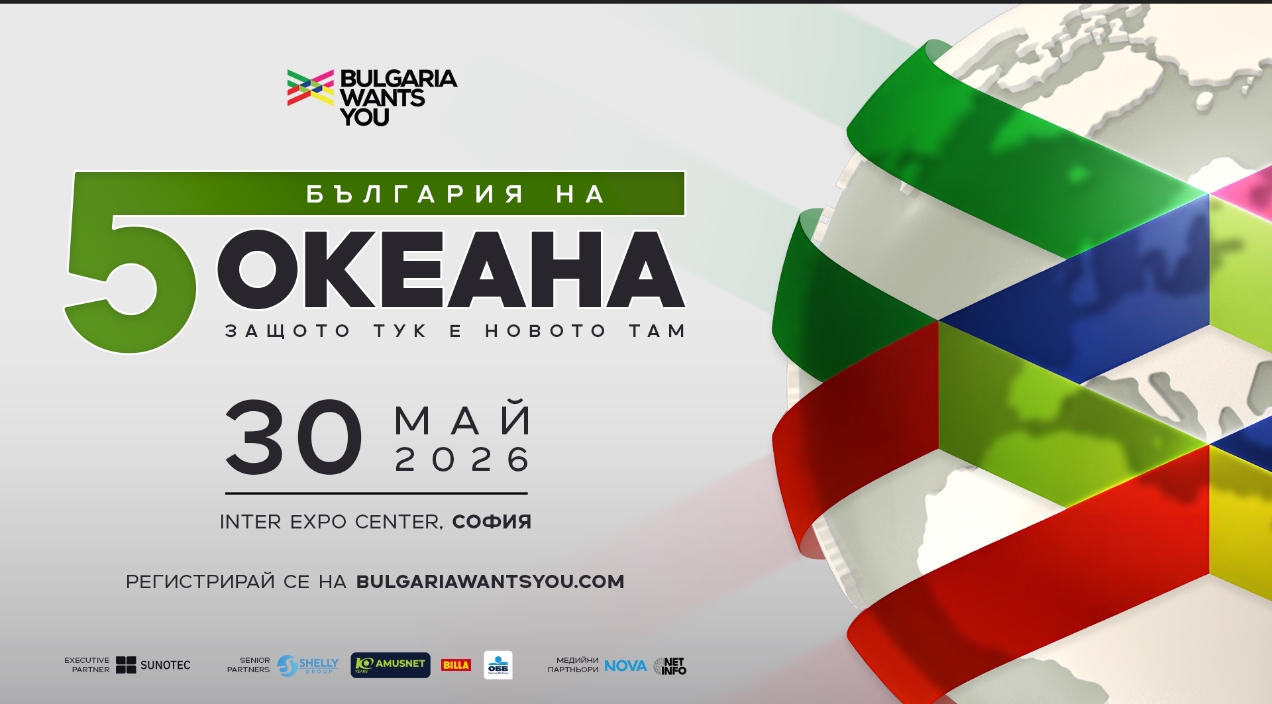 Една година след като постави нов стандарт за кариерни и обществено значими събития у нас, форумът „България на пет океана“ на Bulgaria Wants You  се завръща с второ издание.На 30 май (събота) столичният Интер Експо Център отново ще събере на едно място българи от страната и чужбина, водещи компании, визионери и лидери на общественото мнение, за да представи реалните възможности за изграждане на кариера и живот в България.