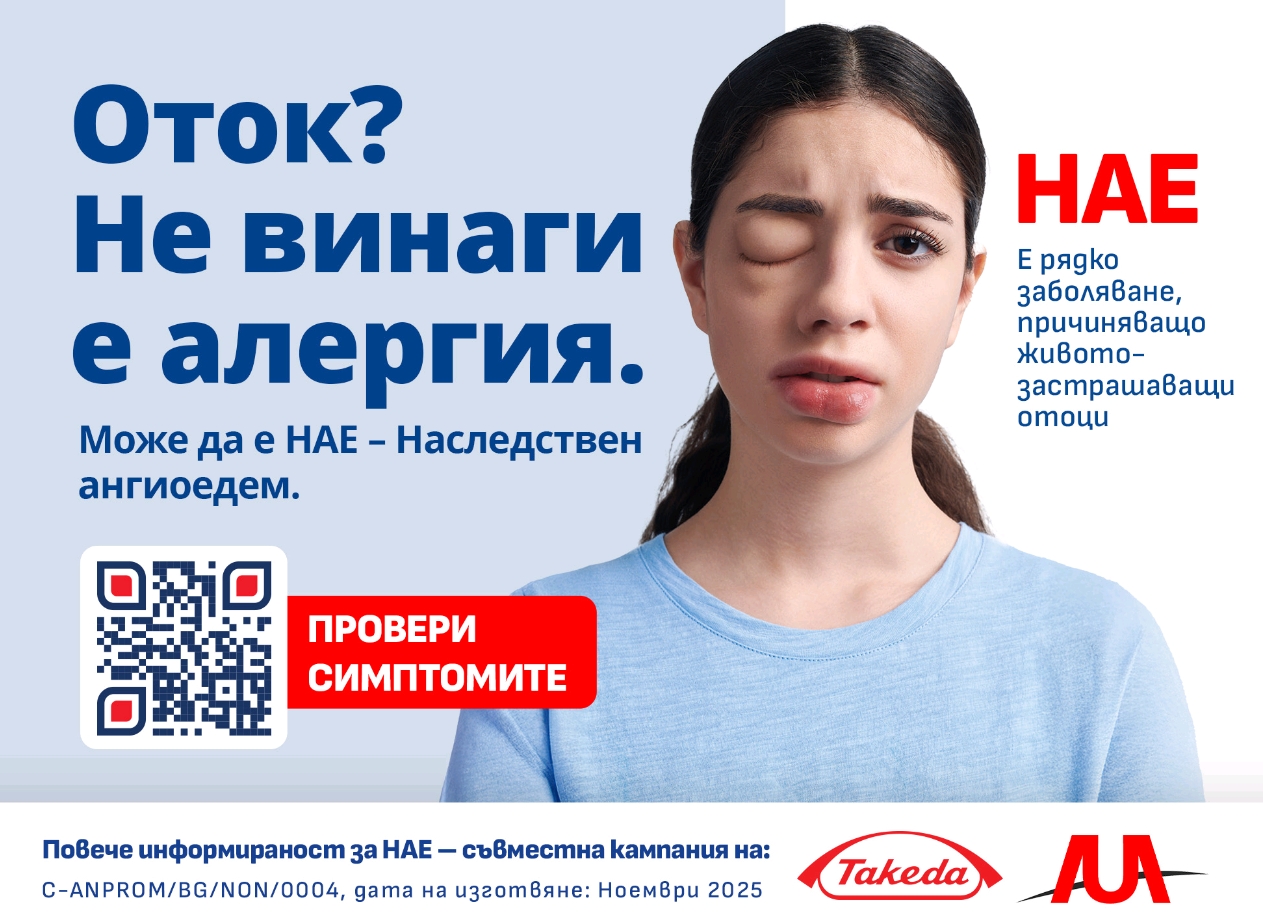Асоциация „Ангиоедем, Уртикария и Астма (ААУА)“ в партньорство с фармацевтичната компания „Takeda България“ стартират национална информационна кампания, посветена на разпознаването и ранната диагностика на наследствения ангиоедем (НАЕ) – рядко генетично заболяване, което често остава недиагностицирано с години. Наследственият ангиоедем засяга приблизително 1 на 10 000 до 1 на 50 000 души[1] и се проявява с пристъпни отоци на различни части на тялото – крайници, лице, корем, както и в областта на гърлото. Отоците на дихателните пътища са най-опасната проява, тъй като могат да доведат до задушаване.