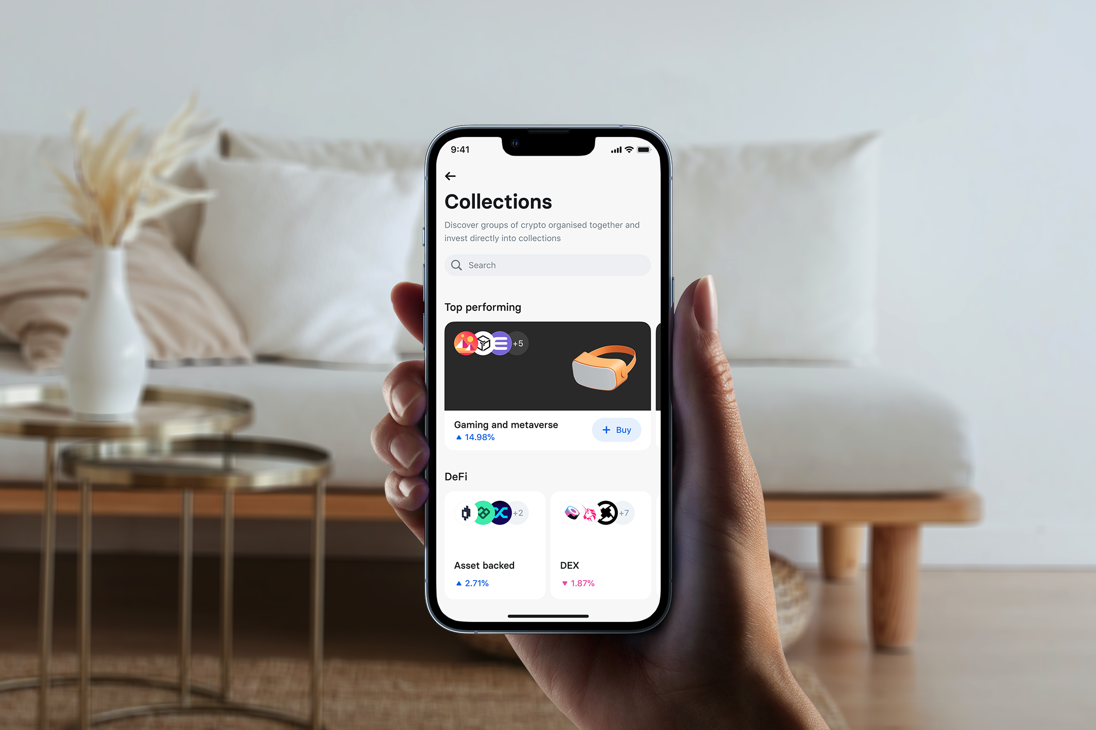 Crypto Collections групира 100+ токена, налични в нашето приложение, в колекции въз основа на основната технология и случая на използване на токена. Клиентите също имат възможността да закупят цяла колекция и да разпределят инвестицията си равномерно между всички токени в колекцията. Примери за крипто колекции са Metaverse, NFT, Layer 1 и Defi. Клиентът може също да проследи колекцията като цяло, в обобщен изглед.