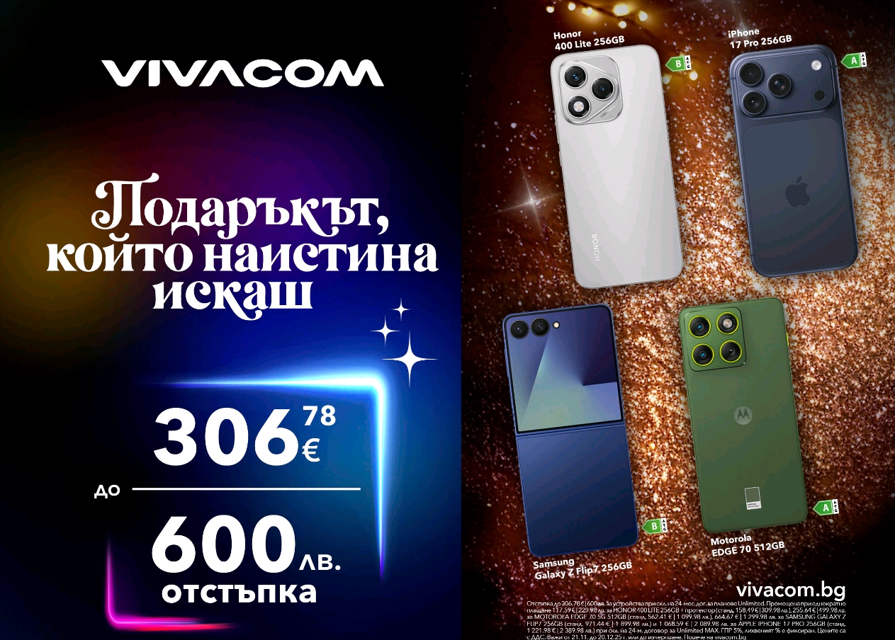 С наближаването на празниците Vivacom прави избора на подарък по-лесен от всякога със серия от празнични предложения за своите клиенти. Телекомът предлага ексклузивни отстъпки до 306.78 € | 600 лв. на избрани модели последно поколение смартфони. В празничната селекция попадат едни от най-желаните устройства на годината на Apple, Samsung, Motorola и HONOR, които съчетават висока производителност, елегантен дизайн и иновативни функции – подаръкът, който вие или вашите любими хора наистина искат. Офертите са валидни до 20 декември 2025 г. при сключване на 24-месечен договор с план от семейството Unlimited. Отстъпките са част от серията атрактивни предложения за подаръци през декември, които телекомът предлага за своите клиенти, за да допринесе за една истински вълшебна Коледа с Vivacom.